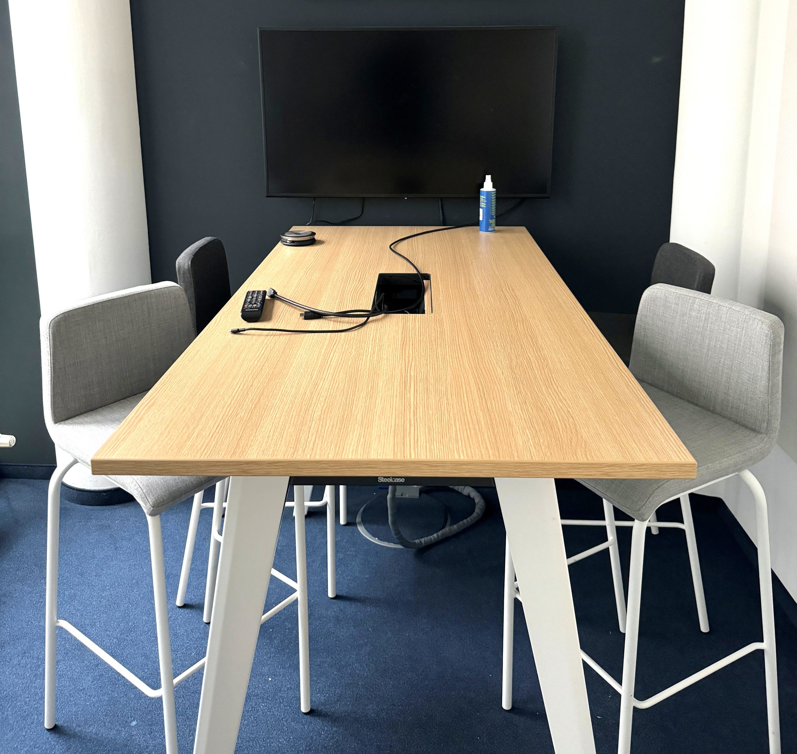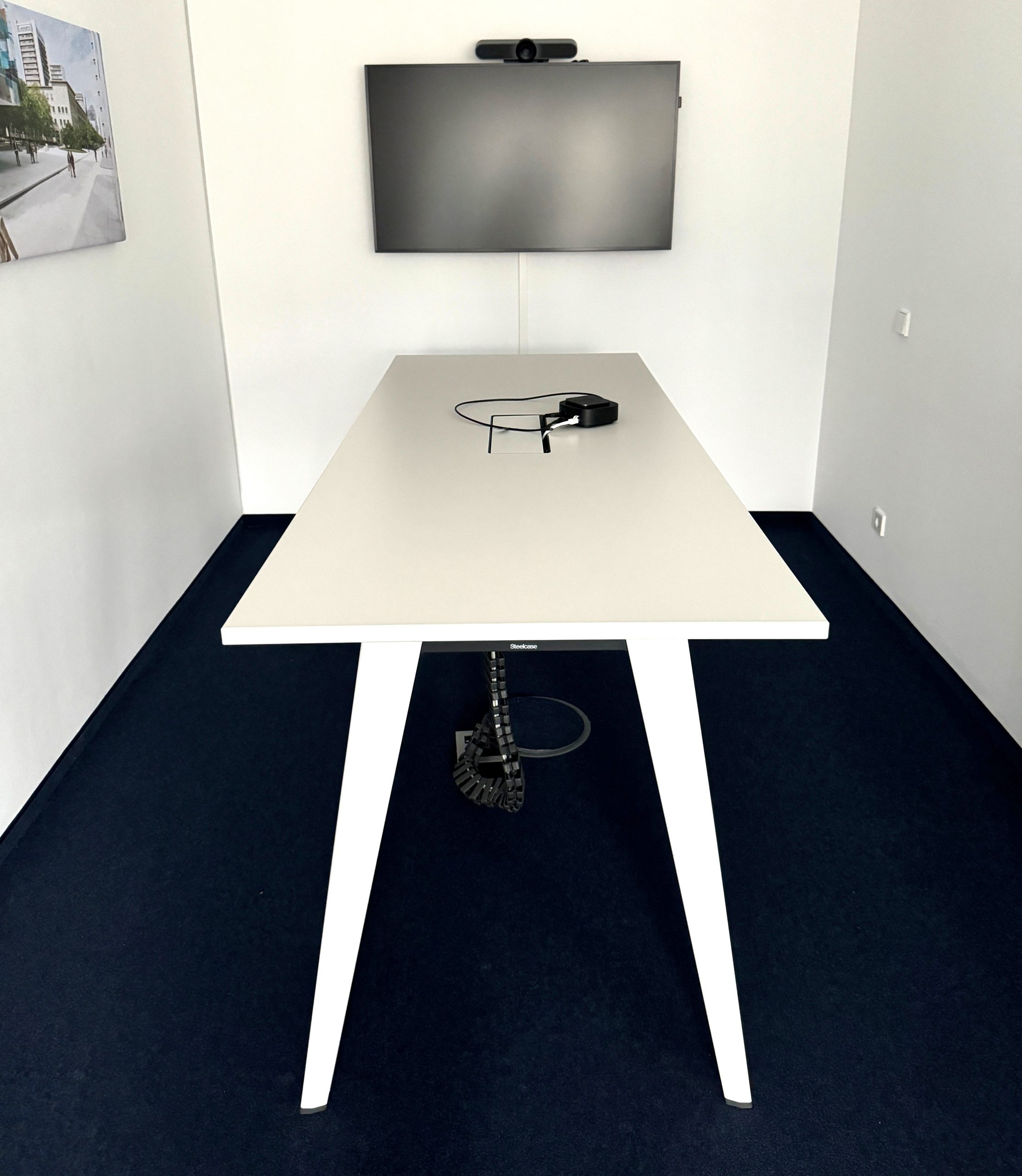 Steelcase Stehkonferenztisch mit Kabelkanal.
